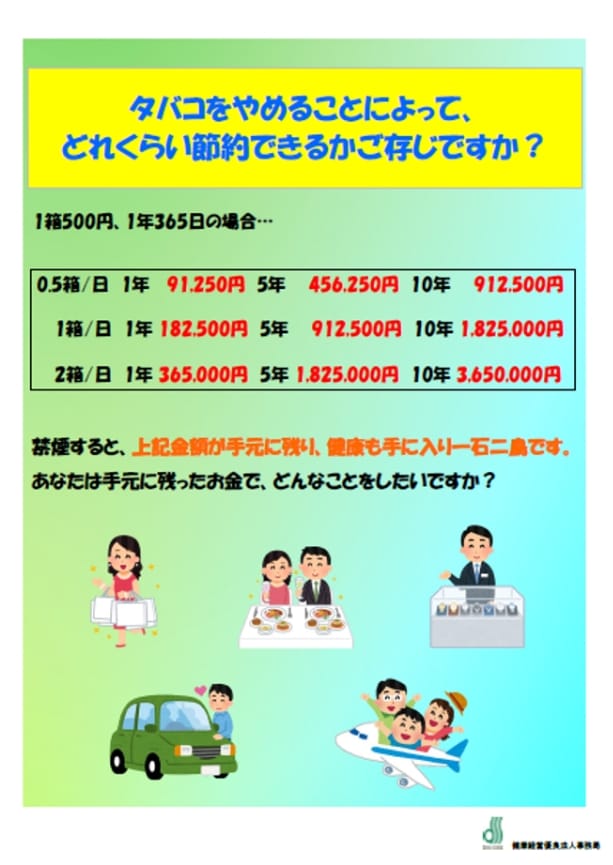 禁煙にまつわるポスターの掲示、 禁煙セミナーの実施、 禁煙グッズの配布等の 取り組みを行っています。