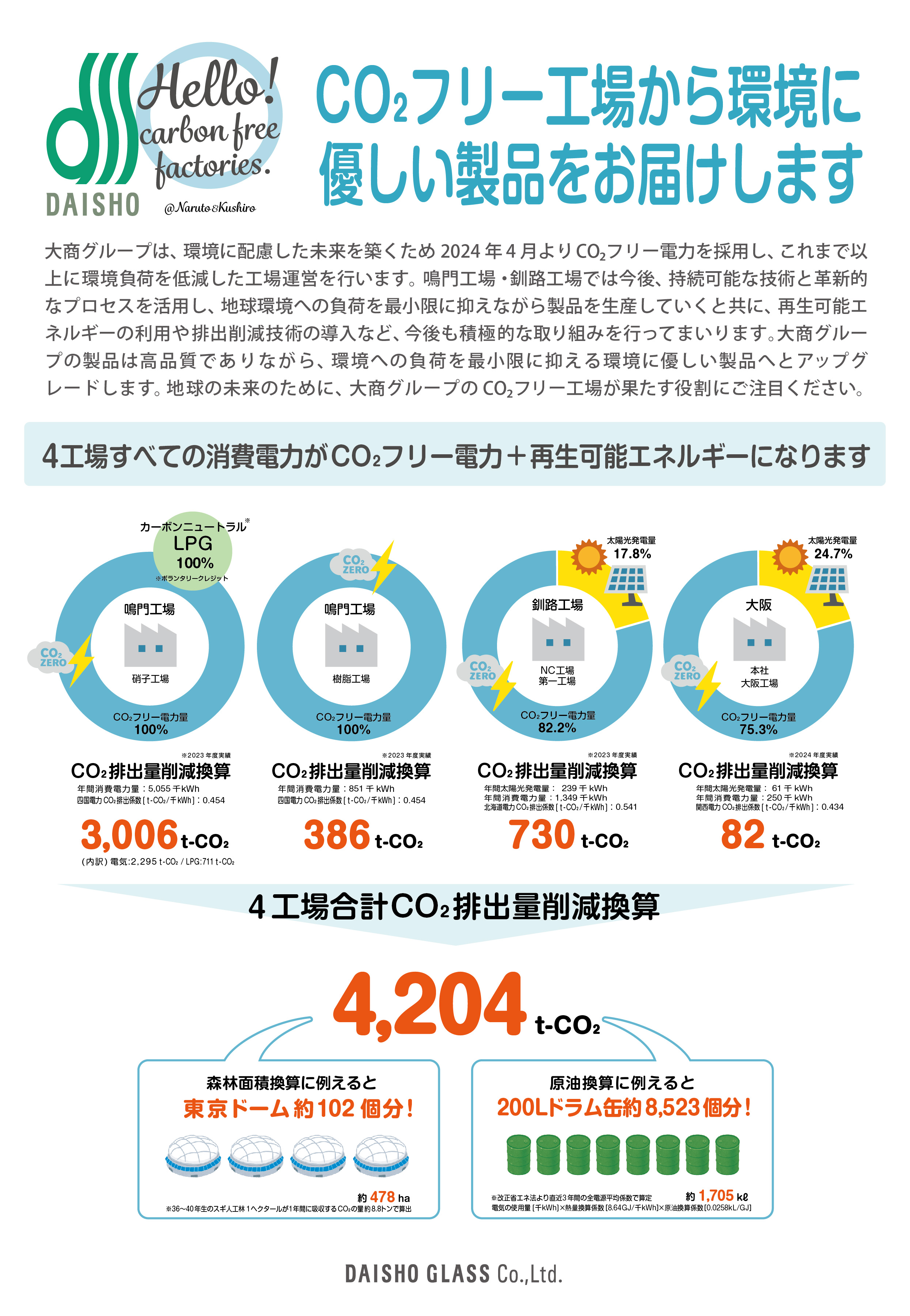 大商グループ3工場(鳴門硝子工場・鳴門樹脂工場・釧路工場)のすべての消費電力がCO2フリー電力+再生可能エネルギーになりました!